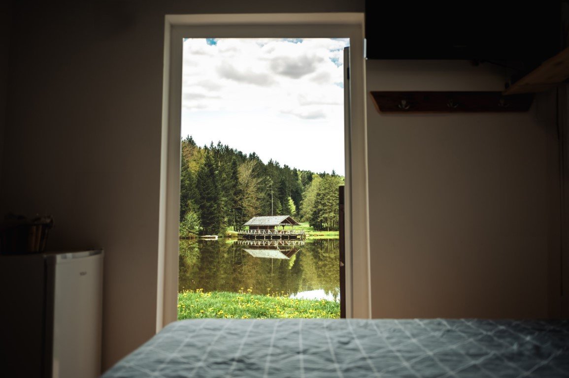 Apartma ob plaži ribnika, narava, savna in intima v objemu zelenja.
